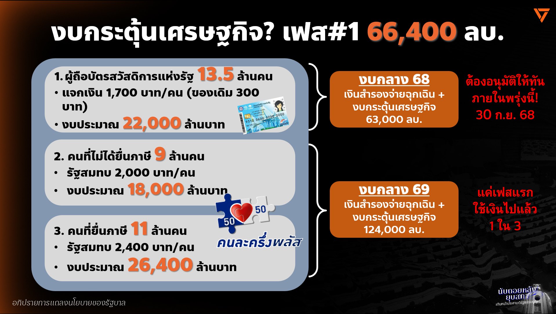 - ผู้ที่ไม่ได้อยู่ในระบบภาษี จำนวนประมาณ 11 ล้านคน ได้เงินคนละ 2,000 บาท สามารถใช้จ่ายได้ไม่เกิน 200 บาทต่อวัน โดยรัฐช่วยจ่าย 50% และประชาชนจ่าย 50%