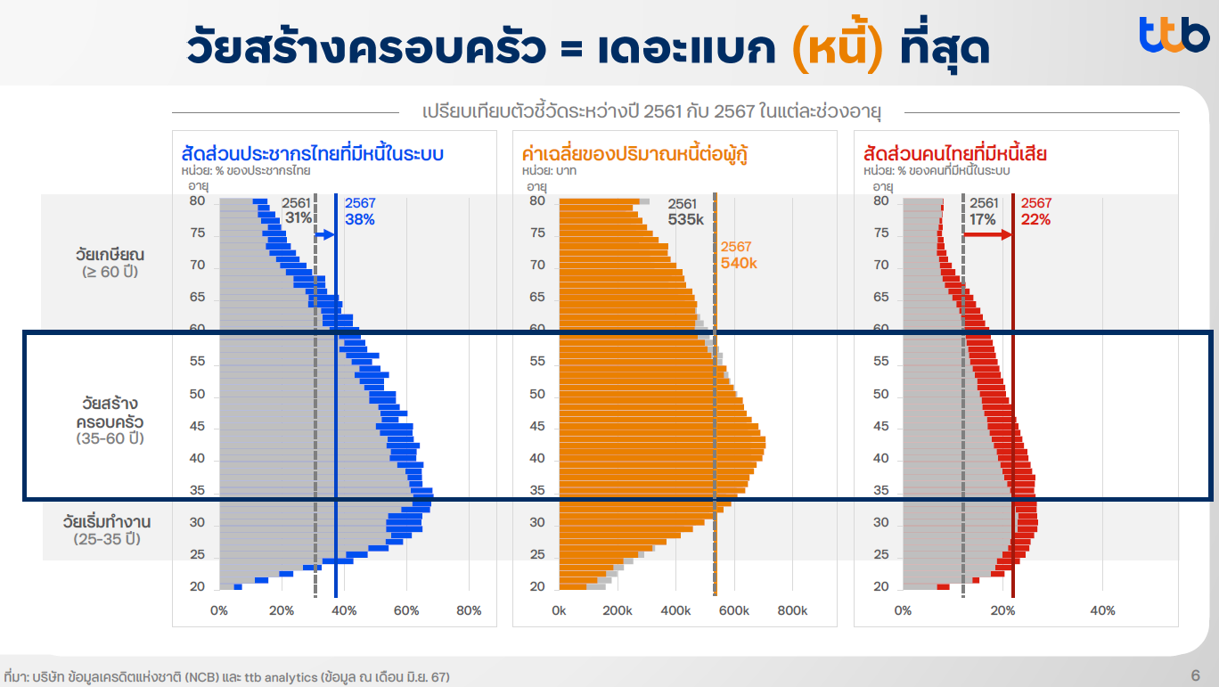 ข้อมูลเครดิตแห่งชาติ หรือเครดิตบูโร (NBC) ณ เดือน มิ.ย. 67 พบว่าคนไทยมีหนี้ในระบบสถาบันการเงิน คิดเป็นสัดส่วน 38% ของประชากรทั้งหมด เพิ่มขึ้นจากปี 61 ที่มีสัดส่วน 31% ของประชากรทั้งหมด โดยปริมาณหนี้ส่วนใหญ่จะอยู่ในกลุ่มคนวัยทำงานตั้งแต่ 25–60 ปี มูลค่าหนี้เฉลี่ยคนละ 540,000 บาท เพิ่มขึ้นประมาณ 10% ในช่วง 6 ปี ที่ผ่านมา และคนเหล่านี้เกือบครึ่งก่อหนี้ซ้อนกันถึง 5 สินเชื่อ