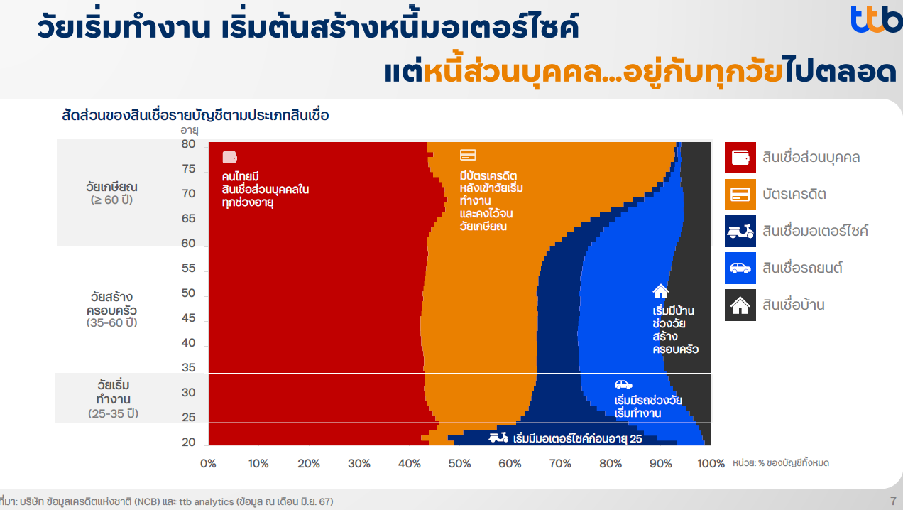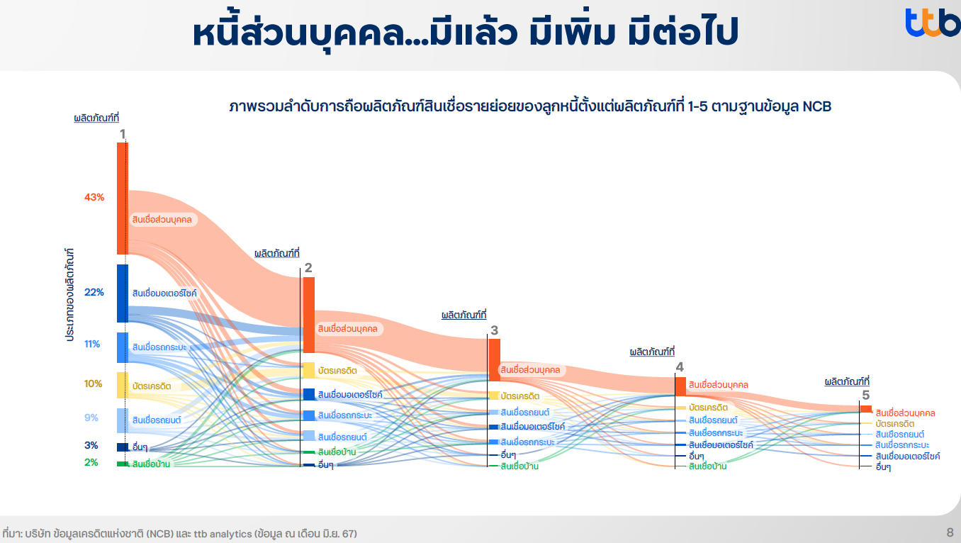 นริศ สถาผลเดชา ประธานกลุ่มงาน Data และ Analytics ทีเอ็มบีธนชาต สะท้อนว่า ปัจจุบันสัดส่วนหนี้ครัวเรือนไทย 87% ต่อผลิตภัณฑ์มวลรวมในประเทศ (GDP) ไม่ได้สูงกว่าประเทศเพื่อนบ้านมาก แต่ในเชิงโครงสร้างนั้น หนี้ส่วนบุคคลของไทยกลับมีสัดส่วนถึง 40% สูงกว่าประเทศเพื่อนบ้านที่อยู่ในระดับกว่า 20% ถือเป็นจุดเปราะบางของหนี้ครัวเรือนไทย เพราะเป็นหนี้ที่นำมาเพื่อบริโภค หรือบางรายนำไปจ่ายหนี้ก้อนอื่น ซึ่งไม่ได้ก่อให้เกิดประโยชน์เหมือนหนี้รถและหนี้บ้าน