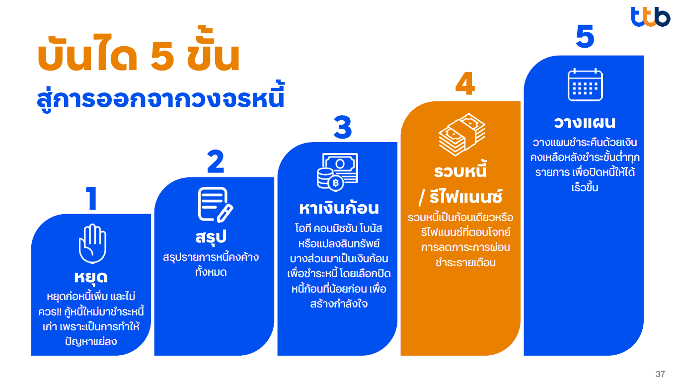 วิธีออกจากวงจนหนี้ เริ่มจาก 1.หยุดก่อหนี้เพิ่ม 2.รวบรวมหนี้ที่ค้างอยู่ทั้งหมด 3.หาเงินก้อนมาทยอยชำระหนี้ 4.รวบรวมหนี้เป็นก้อนเดียวหรือรีไฟแนนซ์ลดภาระการผ่อน 5.วางแผนชาระคืนด้วยเงินคงเหลือหลังชำระขั้นต่า