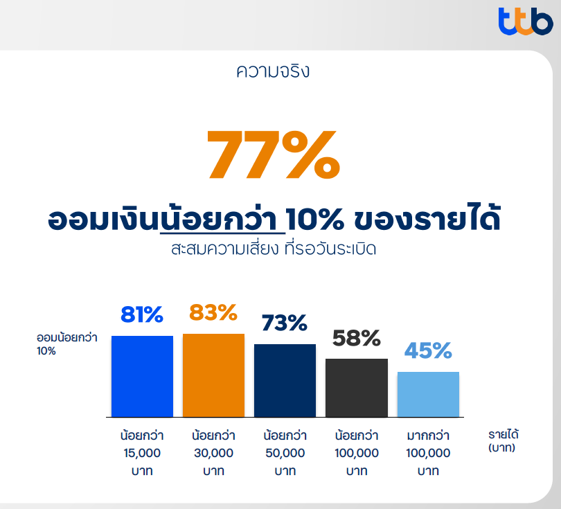 จากข้อมูลดังกล่าวสะท้อนให้เห็นว่า พฤติกรรมทางการเงินของมนุษย์เงินเดือนส่วนใหญ่ยังขาดภูมิคุ้มกันทางการเงินที่เพียงพอ โดยพบว่ามนุษย์เงินเดือนสัดส่วน 77% มีเงินออมน้อยกว่า 10% ของรายได้ และสัดส่วน 70% ไม่มีเงินสำรองฉุกเฉินเพียงพอ หรือมีเงินสำรองฉุกเฉินไว้ใช้น้อยกว่า 6 เดือน นอกจากนี้มนุษย์เงินเดือนสัดส่วนมากถึง 80% ไม่มีความคุ้มครองที่เพียงพอหากเจ็บป่วยเป็นโรคร้ายไม่คาดฝัน