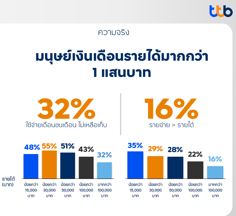 อย่างไรก็ตามความไม่มั่นคงทางการเงินยังสามารถเกิดขึ้นกับทุกระดับรายได้ โดยจากข้อมูลพบว่า 32% ของผู้ที่มีรายได้เกิน 100,000 บาทต่อเดือน ใช้ชีวิตเดือนชนเดือน และอีก 16% มีรายจ่ายมากกว่ารายได้ สะท้อนว่าความไม่มั่นคงทางการเงินเกิดขึ้นกับทุกระดับรายได้