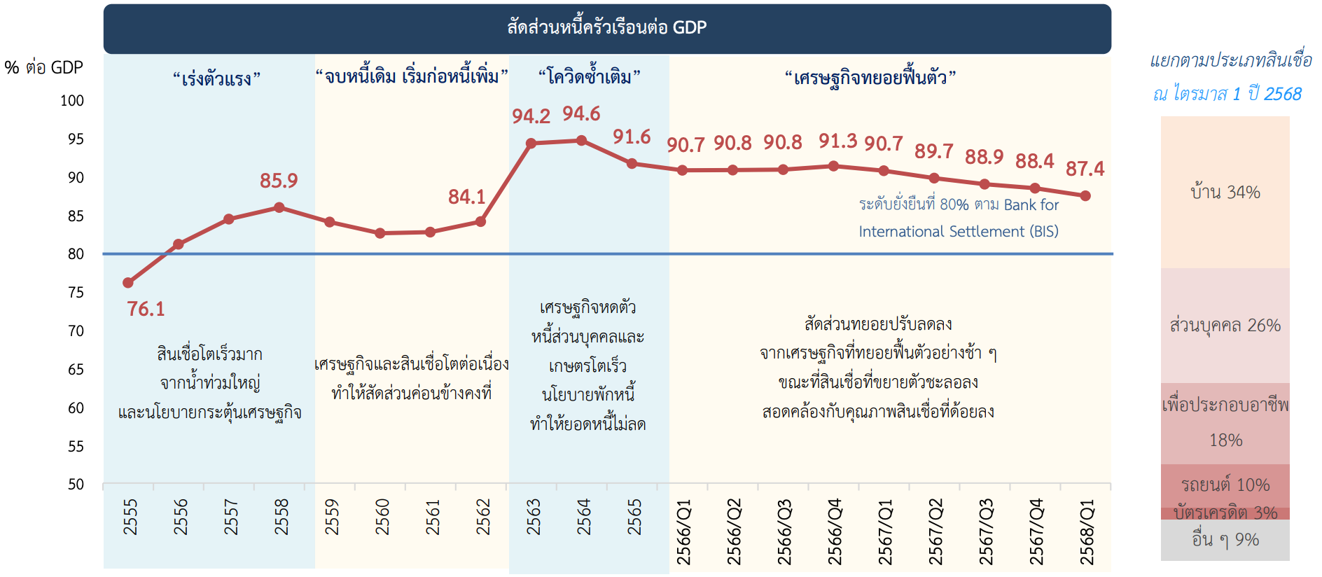 ธปท.ระบุว่ายังต้องติดตามภาวะการเงินที่ยังตึงตัวและความสามารถในการชําระหนี้ของภาคธุรกิจและ ครัวเรือนโดยเฉพาะกลุ่มเปราะบางที่รายได้ฟื้นตัวช้าและมีภาระหนี้สูง รวมถึงธุรกิจและครัวเรือนที่อาจ ได้รับแรงกดดันเพิ่มเติมต่อฐานะการเงินจากผลกระทบมาตรการทางภาษีของสหรัฐอเมริกา ตลอดจนติดตาม ผลสําเร็จของการให้ความช่วยเหลือภายใต้โครงการคุณสู้เราช่วย โดยสัดส่วนหนี้ครัวเรือนต่อ GDP ไตรมาส 1 ปี 2568 ปรับลดลงจากไตรมาสก่อน จากสินเชื่อภาคครัวเรือนที่ขยายตัวชะลอลงเป็นสําคัญ ขณะที่ภาคธุรกิจมี สัดส่วนหนี้สินต่อ GDP ลดลงตามการขยายตัวของเศรษฐกิจ ขณะที่การก่อหนี้ทรงตัว