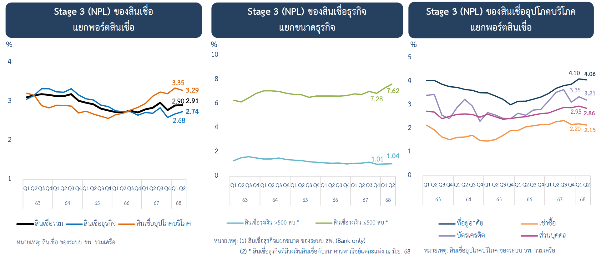 สำหรับ ยอดคงค้างสินเชื่อที่เป็รหนี้ไม่ก่อให้เกิดรายได้ (NPL) ไตรมาส 2 ปี 2568 ปรับเพิ่มขึ้นเล็กน้อยมาอยู่ที่ 5.55 แสนล้านบาท โดยหลักจากสินเชื่อธุรกิจ ขณะที่ปริมาณ NPL ของสินเชื่ออุปโภคบริโภคปรับลดลงทุกประเภท ส่งผลให้สัดส่วน NPL ต่อสินเชื่อรวม ทรงตัวอยู่ที่ 2.91%