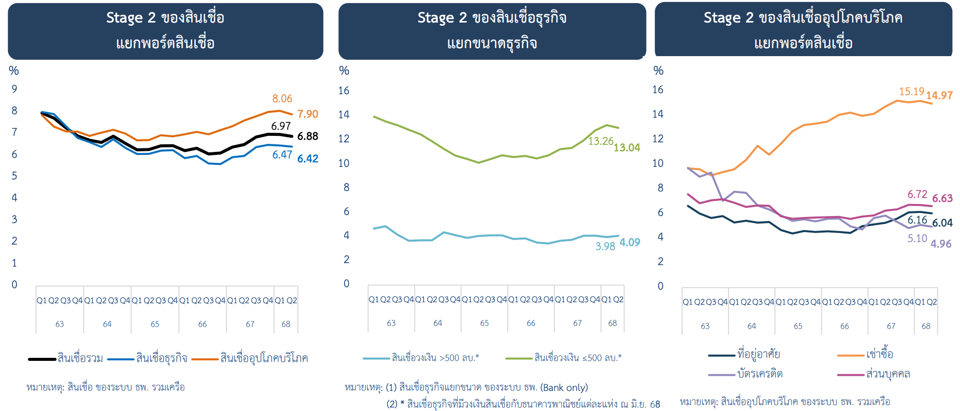 ในไตรมาส 2 สินเชื่อ Stage 2 ปรับลดลงในเกือบทุกพอร์ต โดยหลักเป็นการจัดชั้นดีขึ้นของลูกหนี้ที่สามารถชําระหนี้ไดตามเงื่อนไขปรับปรุงโครงสร้างหนี้ส่งผลให้สัดส่วน stage 2 ลดลงอยู่ที่ 6.88% อย่างไรก็ดีธนาคารพาณิชย์ยังให็ความช่วยเหลือลูกหนี้อย่างต่อเนื่อง รวมทั้งบริหารจัดการคุณภาพหนี้
