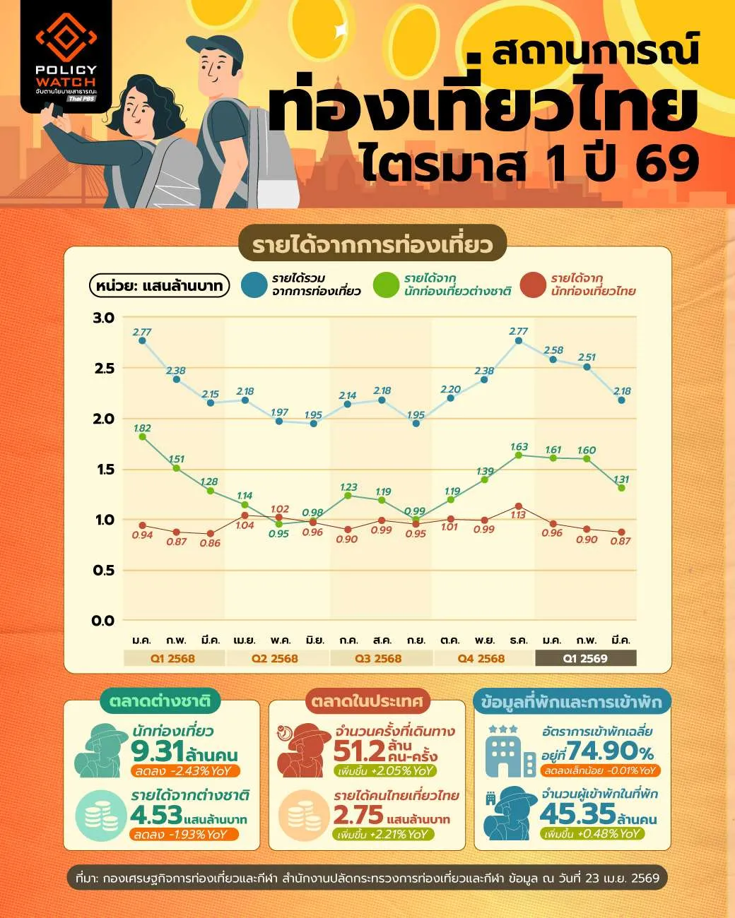 กองเศรษฐกิจการท่องเที่ยวและกีฬา สำนักงานปลัดกระทรวงการท่องเที่ยวและกีฬา รายงานว่า ในไตรมาส 1 ปี 2569 (1 ม.ค. – 31 มี.ค.) ประเทศไทยมีนักท่องเที่ยวต่างชาติรวม 9.31 ล้านคน ลดลง 2.43% เมื่อเทียบจากช่วงเดียวกันของปีก่อนหน้า