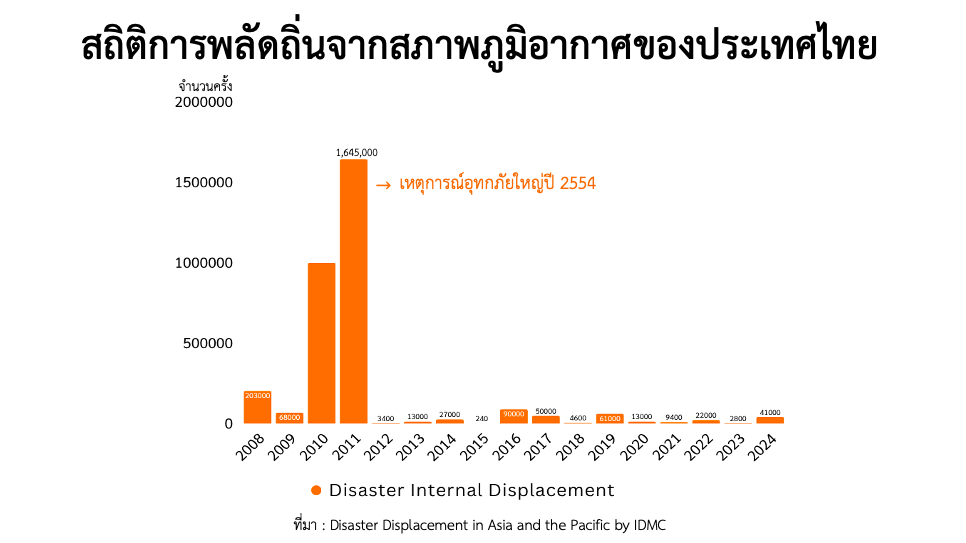 ขณะที่ประเทศไทย มีรายงานการพลัดถิ่นครั้งใหญ่เมื่อปี 2554 สูงถึง 1.64 ล้านครั้ง เนื่องจากเหตุการณ์อุทกภัยครั้งใหญ่ ที่แสดงให้เห็นถึงความเปราะบางของสังคมและความท้าทายในการจัดการภัยพิบัติเชิงนโยบาย