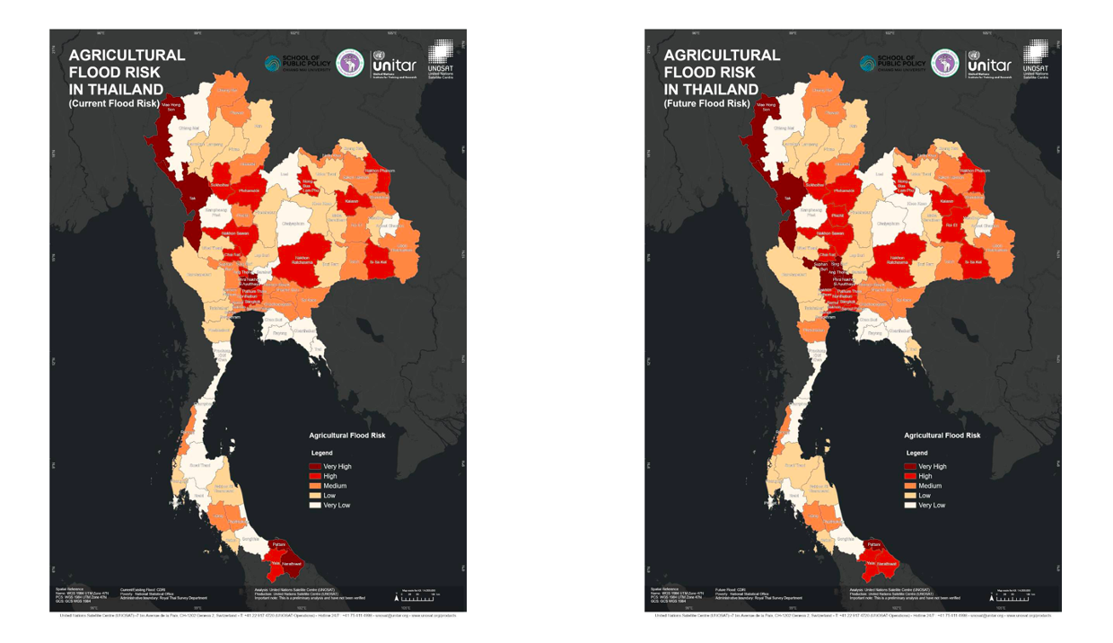 ดูอย่างภาพนี้ เป็นภาพเปรียบเทียบระหว่างปัจจุบันและอนาคต โดยสีแดงที่เข้มมากจะสะท้อนให้เห็นว่าจังหวัดนั้น “เสี่ยงสูง” เป็นพื้นที่ที่มีน้ำท่วมซ้ำซาก (Hazard) มีพื้นที่ทางการเกษตรจำนวนมาก (Exposure) และคนในชุมชนส่วนใหญ่ มีรายได้น้อย (Vulnerability)