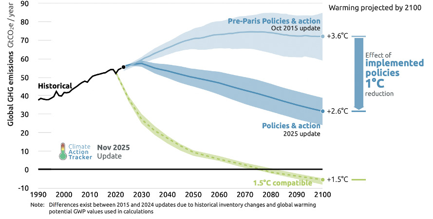 ที่มา: Climate Action Tracker , Global Carbon Project และ https://www.theguardian.com/environment/2025/nov/13/world-still-on-track-for-catastrophic-26c-temperature-rise-report-finds