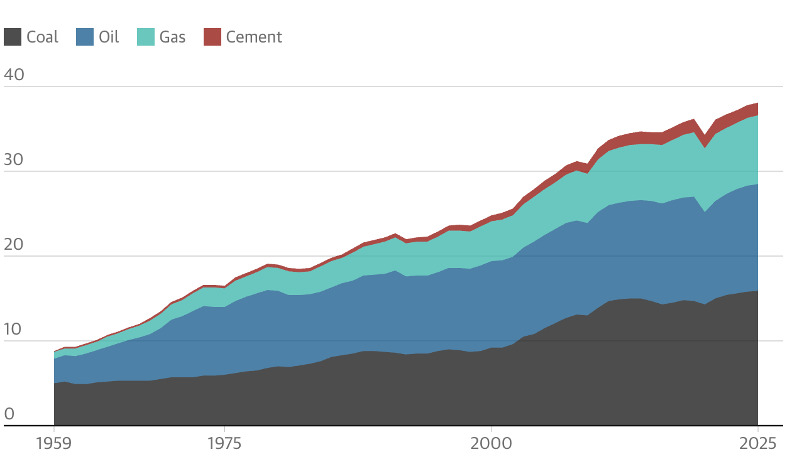 กราฟแสดงการคาดการณ์ว่าจะมี 38.1 พันล้านตันของ CO2 จากเชื้อเพลิงฟอสซิลที่ถูกปล่อยในปี 2025