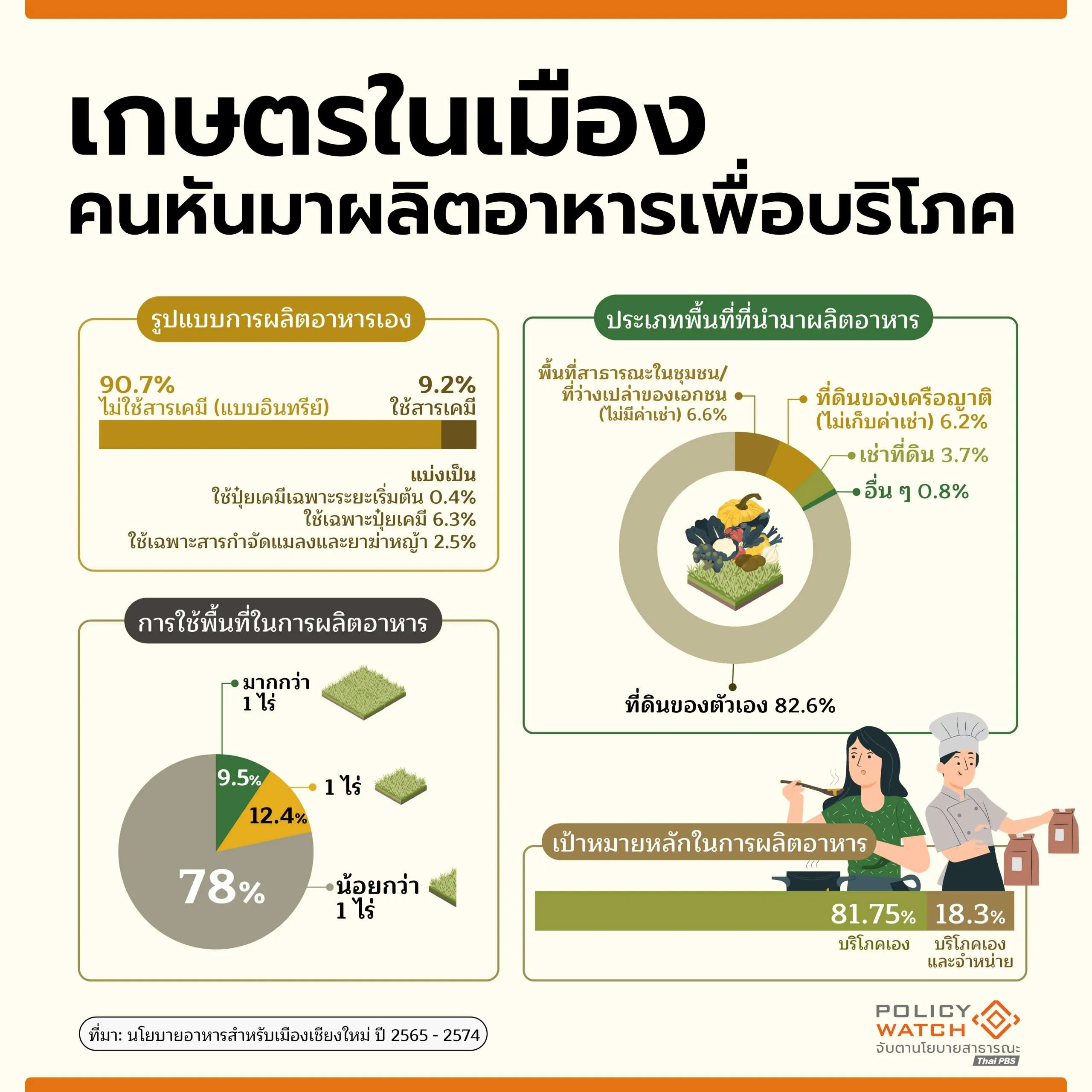 ในกลุ่มที่ผลิตอาหารเองนั้น คนจำนวนมาก 82.6% ผลิตอาหารโดยใช้บริเวณพื้นที่ของตนเอง และส่วนมากไม่ได้มีพื้นที่ขนาดใหญ่ หรือน้อยกว่า 1 ไร่ อย่างไรก็ตาม ถ้ามีการสนับสนุนคนที่ผลิตอาหารโดยไร้สารเคมีได้มากขึ้น ก็จะเป็นผลดีและแรงสำคัญในการกระจายอาหารปลอดภัยในราคาที่เข้าถึงได้ให้กับคนเมืองมากขึ้น
