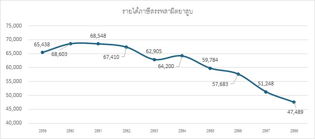 การปรับขึ้นอัตราภาษีสรรพสามิตยาสูบในปี 2564 ทำให้รายได้ของกรมสรรพสามิตจากสินค้ายาสูบลดลงอย่างรุนแรง พร้อมกับอัตราการบริโภคบุหรี่ผิดกฎหมายเพิ่มขึ้นแบบที่ไม่เคยเกินขึ้นมาก่อน โดยในปี 2568 เบื้องต้นสามารถจัดเก็บได้เพียง 4.7 หมื่นล้านบาทเท่านั้น ต่ำกว่าเป้าที่ตั้งไว้อยู่ที่ 4.9 หมื่นล้านบาท