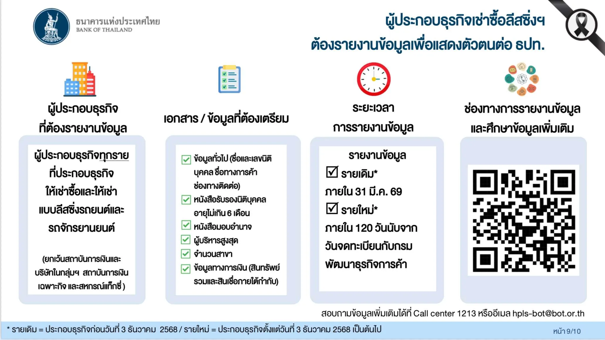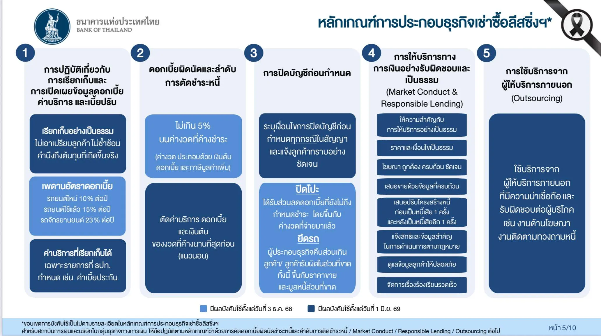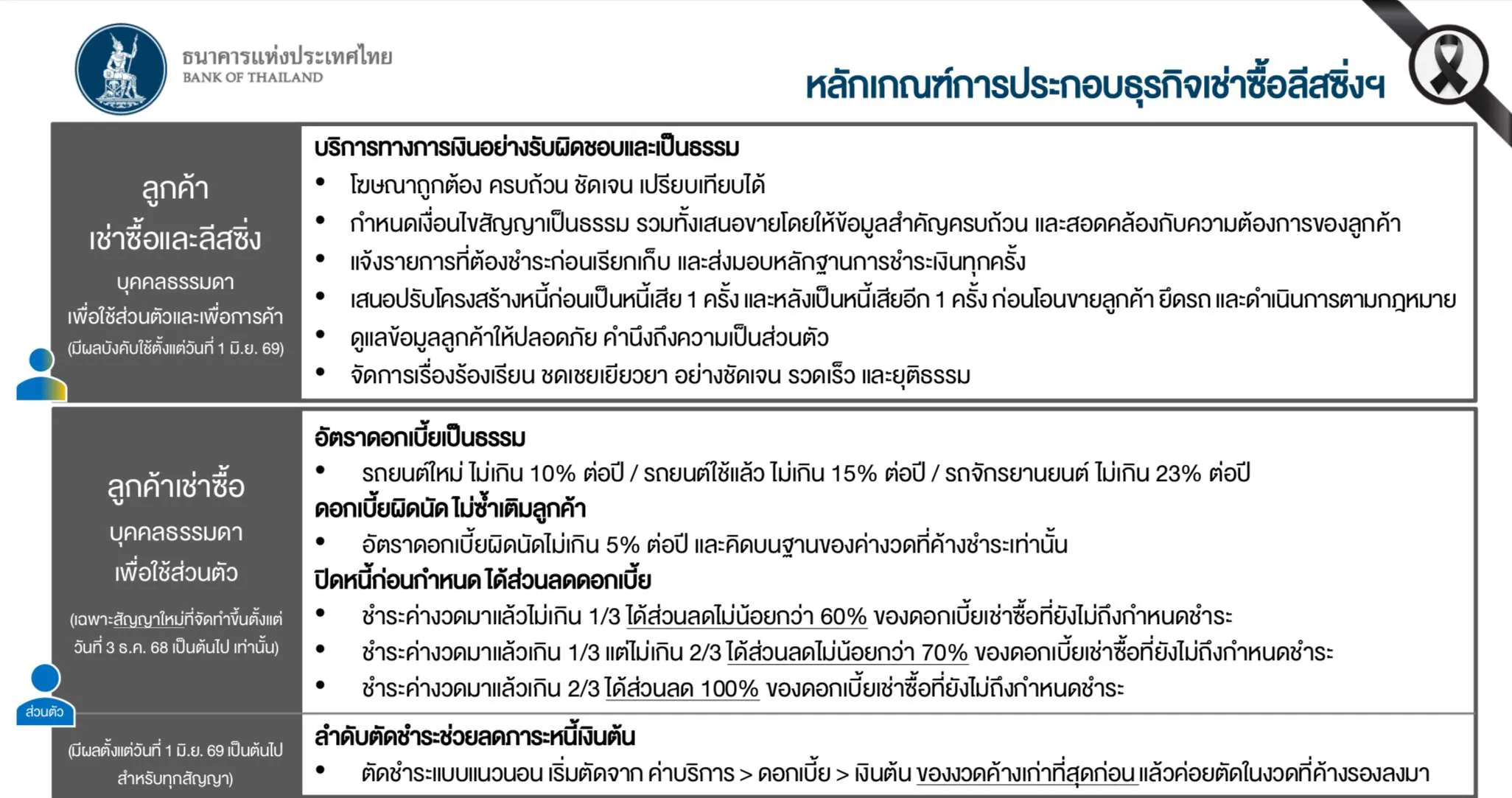หลักเกณฑ์ใหม่ที่ควบคุมธุรกิจเช่าซื้อและลีสซิ่ง (ให้สินเชื่อและปล่อยเช่า) รถยนต์และรถจักรยานยนต์ที่จดทะเบียนนิติบุคคลในไทยทั้งหมด ทั้งไม่ใช่สถาบันการเงิน ต้องอยู่ภายใต้การกำกับดูแล ธปท. เช่นเดียวกับสถาบันการเงิน เพื่อให้มีความรับผิดชอบ เป็นธรรม และโปร่งใส ในการบริการลูกค้าที่ต้องมีมาตรฐาน ตรงกับความต้องการ และได้รับข้อมูลอย่างครบถ้วน ในราคาและเงื่อนไขที่เหมาะสมและเป็นธรรมกับลูกค้า รวมถึงต้องมีกลไกช่วยเหลือเมื่อลูกค้ามีปัญหาชำระหนี้ด้วย
