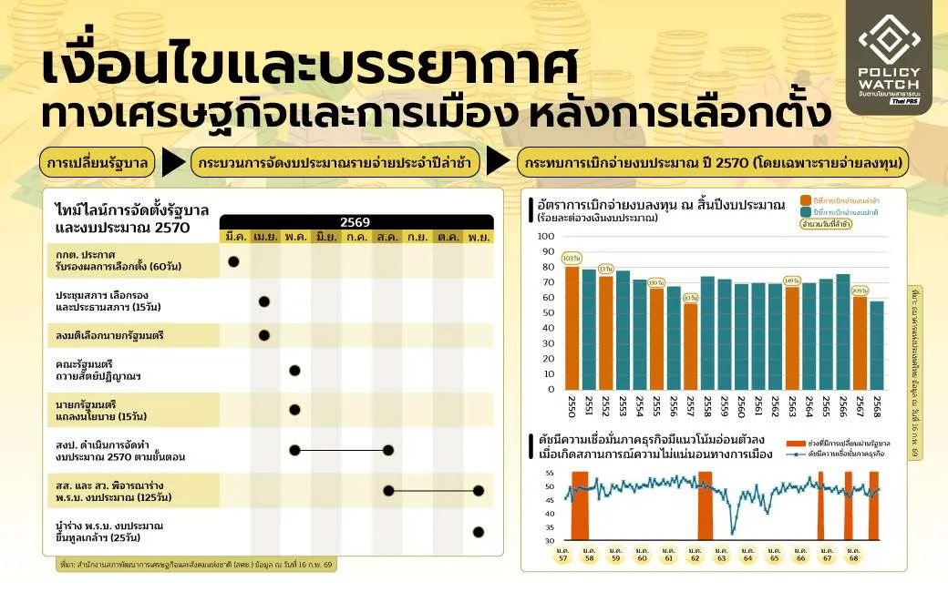 ท่ามกลางความไม่แน่นอนทางการเมืองจากการเลือกตั้ง หลังเกิดข้อร้องเรียนจากประชาชนจำนวนมาก สภาพัฒน์ ประเมินว่า หากการจัดตั้งรัฐบาลใหม่เกิดขึ้นในช่วงระหว่างปลายเดือน มี.ค. และต้น เม.ย. 69 จะส่งผลให้การจัดทำงบประมาณปี 70 ล่าช้าได้สูงสุดประมาณ 2 เดือน