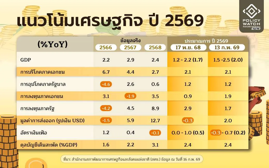 สำนักงานสภาพัฒนาการเศรษฐกิจและสังคมแห่งชาติ (สภาพัฒน์) คาดการณ์เศรษฐกิจไทยปี 2569 จะเติบโตเหลือ 2.0% จากช่วงเดียวกันของปีก่อน (YoY) ลดลงจากปีก่อนที่เติบโต 2.4%YoY ปัจจัยหลักมาการจากลงทุนรวมที่ชะลอลง โดยเฉพาะการลงทุนภาครัฐ เติบโตเหลือ 1.7%YoY ลดลงจาก 8.9%YoY ในปีก่อน และการลงทุนภาคเอกชนเติบโตเหลือ 1.9%YoY จาก 3.5%YoY ในปีก่อนหน้า