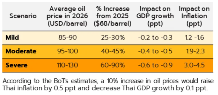 หากสถานการณ์ยืดเยื้อเกินกว่า 3 เดือน และราคาน้ำมันดิบโลกเฉลี่ยในปีนี้ปรับเพิ่มเป็น 80 ดอลลาร์ฯ ต่อบาร์เรล จากกรณีฐานที่ 62 ดอลลาร์ฯ คาดว่าจะมีผลต่อเงินเฟ้อไทยให้เพิ่มสูงขึ้นราว 1.0% โดยไทยพึ่งพาการนำเข้าพลังงานสุทธิสูงถึง 70% โดยเฉพาะน้ำมันดิบที่กว่า 60% นำเข้าจากตะวันออกกลางผ่านช่องแคบฮอร์มุซ เมื่อราคาพลังงานโลกปรับสูงขึ้น จึงกระทบต้นทุนภายในประเทศ เช่น ค่าไฟฟ้า น้ำมันเชื้อเพลิง และก๊าซหุงต้ม (LPG) รวมถึงส่งผ่านไปยังราคาสินค้าและบริการ เช่น อาหารสำเร็จรูปและค่าขนส่ง
