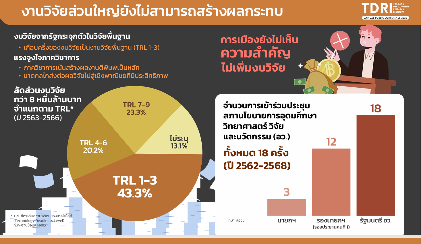 สาเหตุหลักมาจาก งบวิจัยจากภาครัฐกระจุกตัวในการวิจัยพื้นฐาน จะเห็นว่าสัดส่วนงบวิจัยกว่า 8 หมื่นล้านบาท ในช่วง 4 ปีที่ผ่านมา ( 2563-2566 ) หากจำแนก ตามระดับความพร้อมทางเทคโนโลยี หรือ TRL พบว่า เกือบครึ่งหนึ่งเป็นงานวิจัยพื้นฐาน 43.3 %