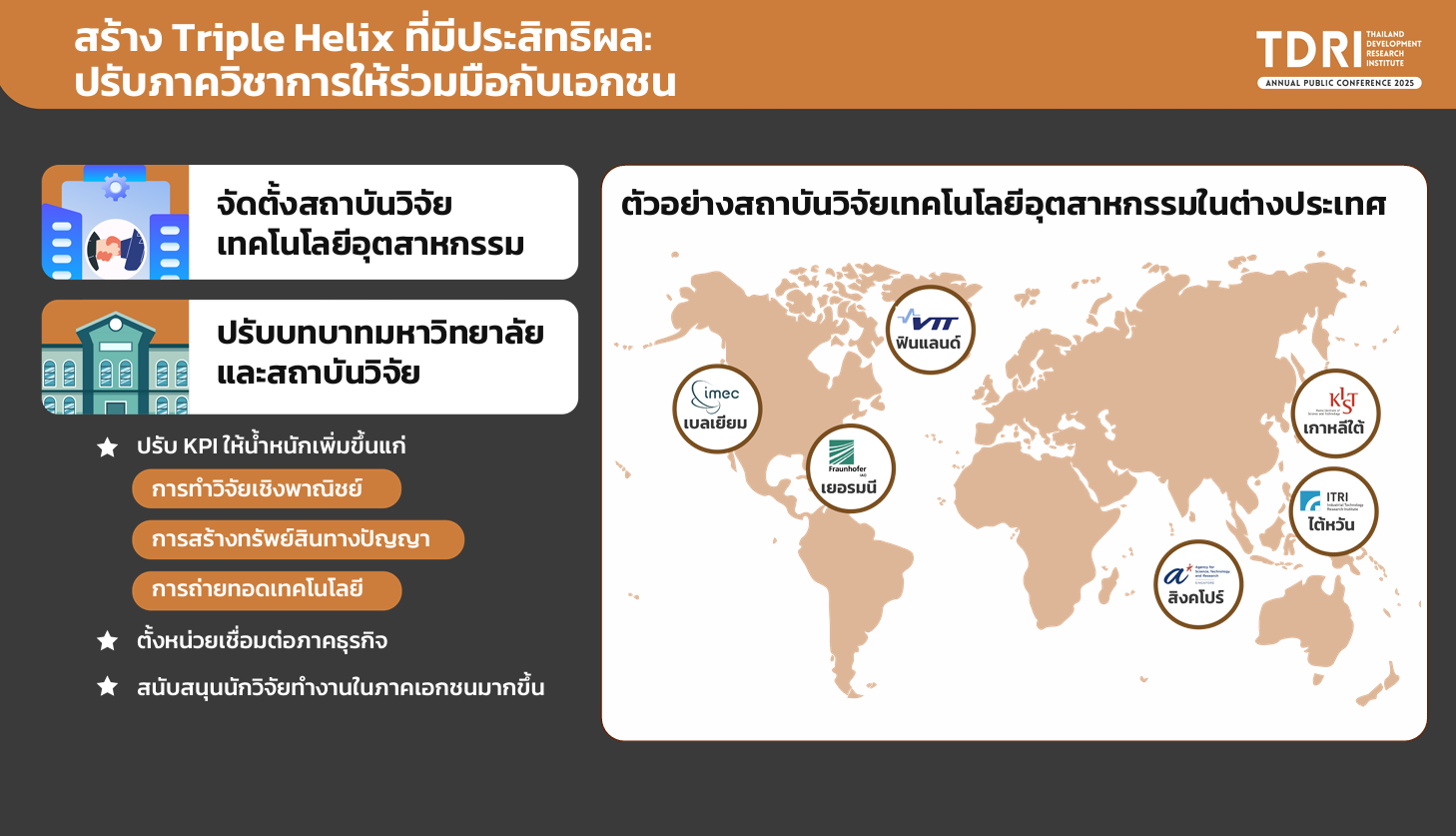- ต้องอาศัยความร่วมมือ 3 ฝ่าย แบบ Triple Helix โดยการประสาน 3 พลัง ระหว่างภาคเอกชน ภาครัฐ และภาควิชาการ โดยภาครัฐต้องทำหน้าที่กำหนดกติกา มาตรการสนับสนุน และสร้างระบบนิเวศที่เอื้อต่อการพัฒนา ภาควิชาการต้องสร้างองค์ความรู้จากการวิจัยที่นำไปใช้ในเชิงพาณิชย์ได้ และผลิตกำลังคนที่มีทักษะ ขณะที่ภาคเอกชนนำเทคโนโลยีไปประยุกต์ใช้จริงเพื่อยกระดับผลิตภาพและการแข่งขันของประเทศ