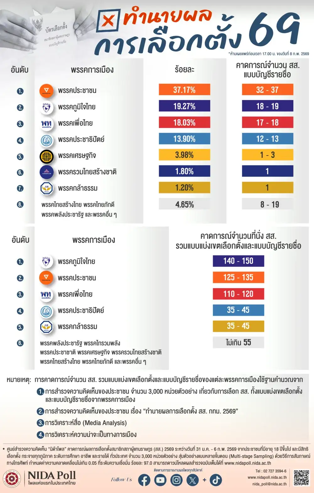 ศูนย์สำรวจความคิดเห็น “นิด้าโพล” สถาบันบัณฑิตพัฒนบริหารศาสตร์ (นิด้า) คาดการณ์ผลการเลือกตั้งสมาชิกสภาผู้แทนราษฎร (สส.) 2569 และแบบบัญชีรายชื่อของแต่ละพรรคการเมือง จากการสำรวจวันที่ 31 ม.ค. – 6 ก.พ. 69