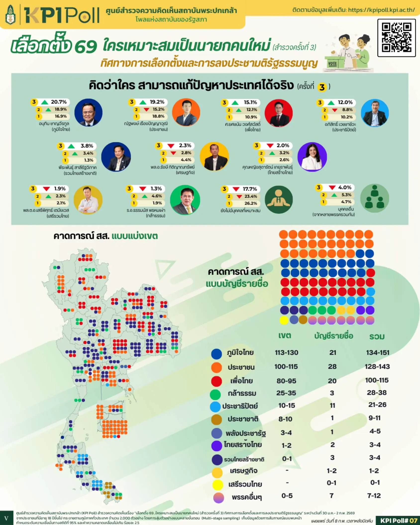 ศูนย์สำรวจความคิดเห็นสถาบันพระปกเกล้า (KPI Poll) คาดการณ์ผลการเลือกตั้งสมาชิกสภาผู้แทนราษฎร (สส.) 2569 แบบเขต และแบบบัญชีรายชื่อของแต่ละพรรคการเมือง จากการสำรวจทั่วประเทษ ระหว่างวันที่ 30 ม.ค. – 2 ก.พ. 69