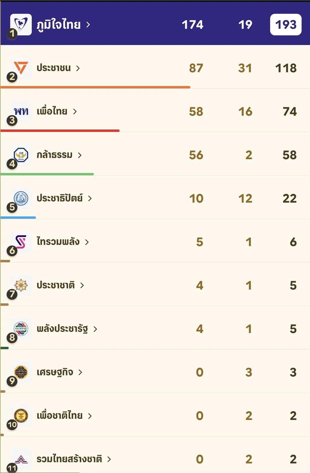 ผลการนับคะแนนอย่างไม่เป็นทางการจากสำนักงานคณะกรรมการการเลือกตั้ง (กกต.) ณ เวลา 11.00 น. ของวันที่ 9 ก.พ. 69 นับคะแนนแล้วคิดเป็น 94% ของจำนวนมากทั้ง โดย พรรคภูมิใจไทย มี สส. แบ่งเขตมากที่สุด เมื่อรวมกับปาร์ตี้ลิสต์ ได้ สส.ทั้งหมด 193 ที่นั่ง ขณะที่พรรคประชาชน มีคะแนนปาร์ตี้ลิสต์มากที่สุด แต่ได้ สส. แบ่งเขตน้อยกว่า ส่งผลให้ได้ สส. ทั้งหมด 118 ที่นั่ง ถัดมาพรรคเพื่อไทย อดีตแกนนำรัฐบาลก่อน ได้ สส. ทั้งหมด 74 ที่นั่ง พรรคกล้าธรรม ได้ 58 ที่นั่ง และพรรคประชาธิปัตย์ ได้ 22 ที่นั่ง