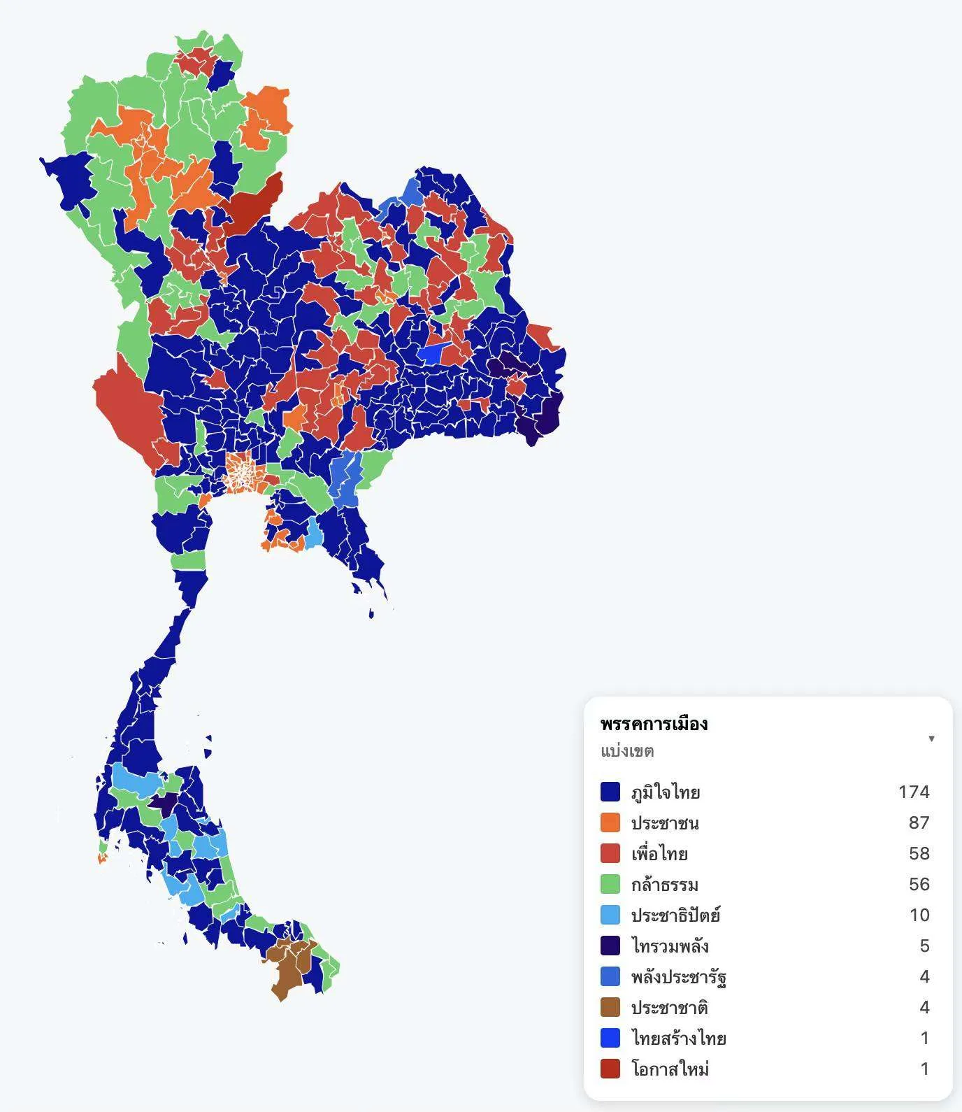 จากรายงานผลเลือกตั้ง 69 ล่าสุด 94% ชัดเจนว่า พรรคภูมิไจไทยชนะการเลือกตั้งที่น่าจะได้คะแนนเขตประมาณ 174 ที่นั่ง และได้คะแนนบัญชีรายชื่อ 19 ที่นั่ง รวมเป็น 193 ที่นั่ง เป็นชัยชนะจาก “คะแนนเขต” ที่กระจุกตัวในภาคอีสาน กลาง ตะวันออก