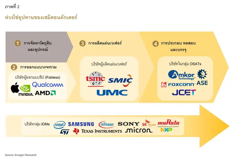 ไทยอยู่ในช่วงปลายของกระบวนการผลิตเซมิคอนดักเตอร์โลก หรือที่เรียกว่ากระบวนการประกอบ ทดสอบ และบรรจุ (ATP) โดยในปี 65 ไทยมีกำลังการผลิตในขั้นตอนนี้ คิดเป็น 2% ของกำลังการผลิตขั้นตอน ATP ทั่วโลก แต่ขั้นตอนการผลิตนี้กลับมีมูลค่าเพิ่มในระดับต่ำ คิดเป็นเพียง 6% ของมูลค่าเพิ่มในห่วงโซ่การผลิตเซมิคอนดักเตอร์โลก เนื่องจากมูลค่าเพิ่มส่วนใหญ่อยู่ในช่วงต้นของห่วงโซ่ คือ กระบวนการออกแบบมีมูลค่าเพิ่มคิดเป็น 59% และการผลิตเวเฟอร์มีมูลค่าเพิ่มคิดเป็น 19%