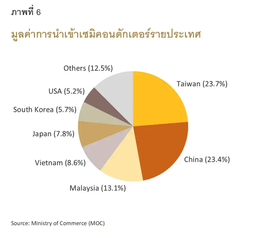 ไทยต้องพึ่งพาวัตถุดิบหลักจากต่างประเทศ โดยนำเข้าวัตถุดิบที่ใช้ในการผลิตอุปกรณ์เซมิคอนดักเตอร์ในปริมาณมาก เช่น แผ่นเวเฟอร์และสารเคมีเฉพาะทางจากประเทศในกลุ่มเอเชียตะวันออกและสหรัฐฯ เพื่อนำมาประกอบและทดสอบ ก่อนส่งกลับไปยังตลาดประเทศต้นทาง นอกจากนี้ ไทยยังต้องพึ่งพาการนำเข้าเทคโนโลยีและเครื่องจักรที่ใช้ในกระบวนการผลิต ส่งผลให้มีต้นทุนการผลิตสูงและเป็นข้อจำกัดของความสามารถในการแข่งขัน