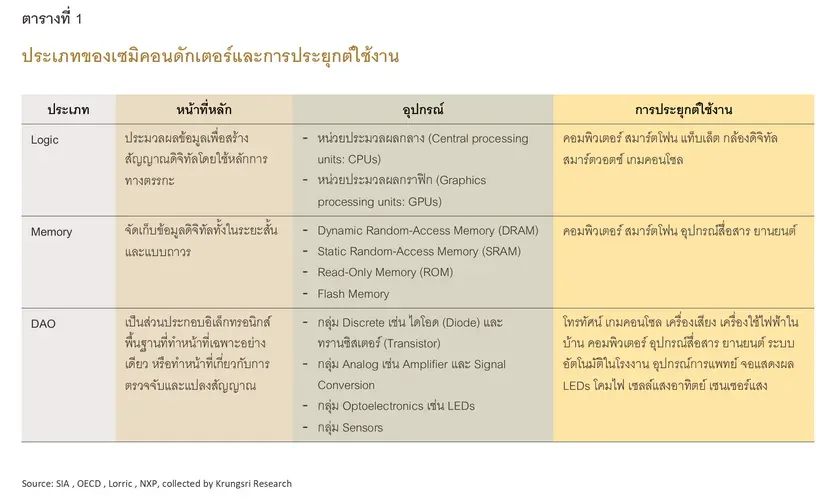 อุปสงค์เซมิคอนดักเตอร์ทั่วโลกมีแนวโน้มเพิ่มขึ้น โดย ไพรซ์วอเทอร์เฮาส์คูเปอส์ (PwC) คาดว่าจะเติบโตเฉลี่ย 7.7% ต่อปี ในช่วงปี 67-73 โดยธุรกิจที่คาดว่าจะใช้อุปกรณ์เซมิคอนดักเตอร์เป็นปัจจัยการผลิตมากที่สุด 3 อันดับแรก ในปี 73 ได้แก่ (1) ธุรกิจเทคโนโลยีการประมวลผล (Computing) คาดว่าจะใช้เซมิคอนดักเตอร์ราว 41% ของมูลค่าตลาดเซมิคอนดักเตอร์ทั้งหมด โดยเฉพาะชิปประเภทประมวลผล (Logic) และหน่วยความจำ (Memory) (2) ธุรกิจด้านการสื่อสาร (Communication) ใช้เซมิคอนดักเตอร์สัดส่วน 31% โดยเฉพาะชิปประเภท Analog และ (3) อุตสาหกรรมยานยนต์ ใช้เซมิคอนดักเตอร์สัดส่วน 13% โดยเฉพาะชิปประเภทแสดงผลบนหน้าจอ (OSD) และ Logic