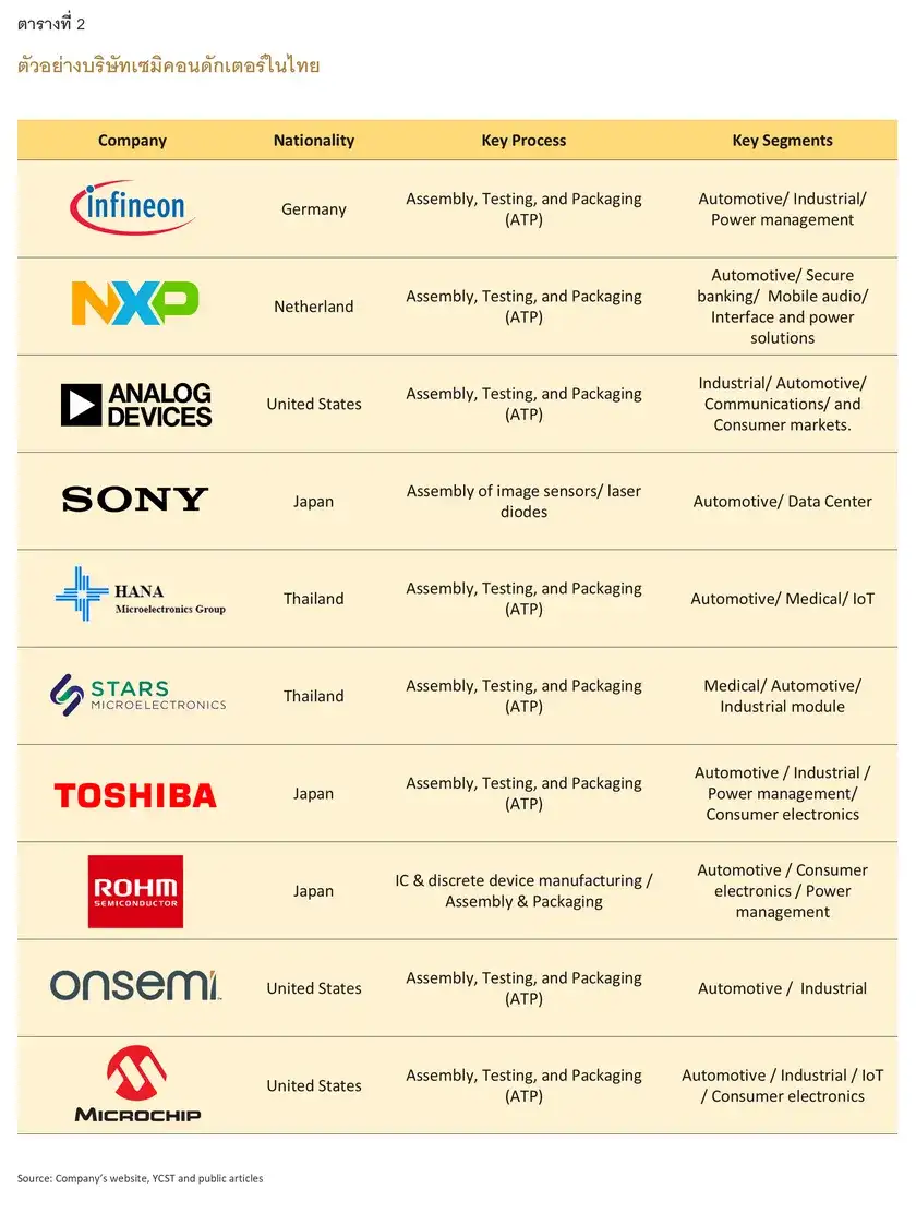 ขณะเดียวกัน อุตสาหกรรมปลายน้ำในไทยที่สำคัญและหลากหลาย เช่น ฮาร์ดดิส (HDD) เครื่องใช้ไฟฟ้า โทรคมนาคม ดาตาเซ็นเตอร์ และยานยนต์สมัยใหม่ ช่วยหนุนความต้องการของอุปกรณ์เซมิคอนดักเตอร์ในประเทศ ข้อได้เปรียบเหล่านี้ถือเป็นปัจจัยสำคัญที่ดึงดูดการลงทุนในอุตสาหกรรมเซมิคอนดักเตอร์อย่างต่อเนื่อง โดยเฉพาะการลงทุนในกิจกรรมการผลิตขั้นต้นน้ำที่มีมูลค่าเพิ่มสูงขึ้น