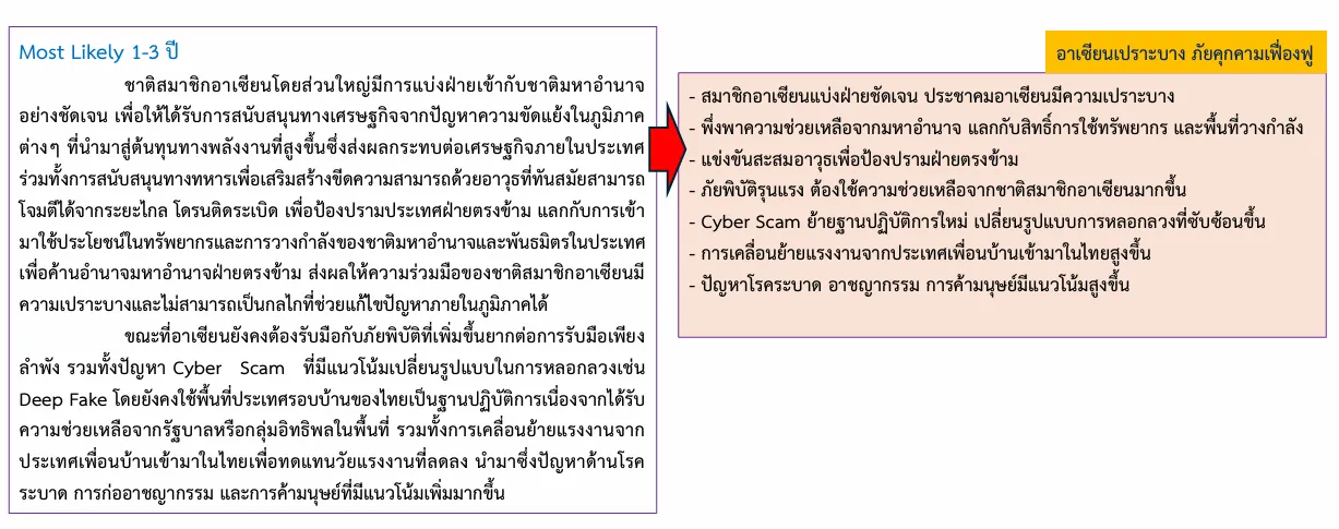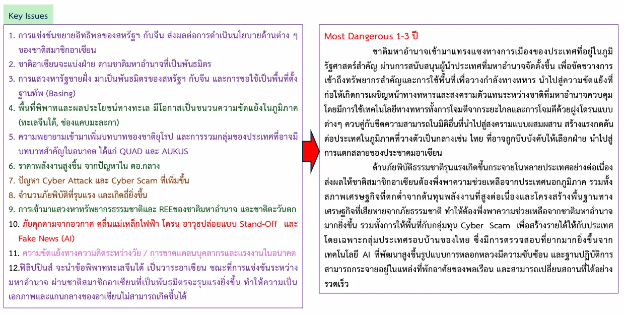 ขณะที่อาเซียนยังคงต้องรับมือกับภัยพิบัติที่เพิ่มขึ้นยากต่อการรับมือเพียงลำพัง รวมทั้งปัญหา Cyber Scam ที่มีแนวโน้มเปลี่ยนรูปแบบในการหลอกลวงเช่น Deep Fake โดยยังคงใช้พื้นที่ประเทศรอบบ้านของไทยเป็นฐานปฏิบัติการเนื่องจากได้รับความช่วยเหลือจากรัฐบาลหรือกลุ่มอิทธิพลในพื้นที่ รวมทั้งการเคลื่อนย้ายแรงงานจากประเทศเพื่อนบ้านเข้ามาในไทยเพื่อทดแทนวัยแรงงานที่ลดลง นำมาซึ่งปัญหาด้านโรคระบาด การก่ออาชญากรรม และการค้ามนุษย์ที่มีแนวโน้มเพิ่มมากขึ้น
