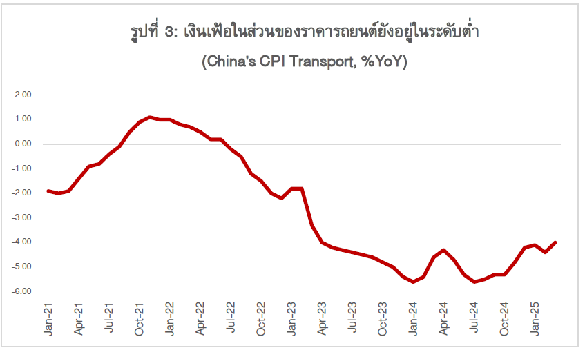 2. สงครามราคาในบางกลุ่มสินค้า เช่น รถยนต์ไฟฟ้า จะยังกดดันเงินเฟ้อให้อยู่ในระดับต่ำ โดยอัตราเงินเฟ้อในส่วนของราคารถยนต์ยังคงปรับลดลง ล่าสุดแบรนด์รถยนต์ไฟฟ้ารายใหญ่ของจีนได้ประกาศปรับลดราคารถยนต์ไฟฟ้าถึง 22 รุ่น สูงสุดถึง 34%