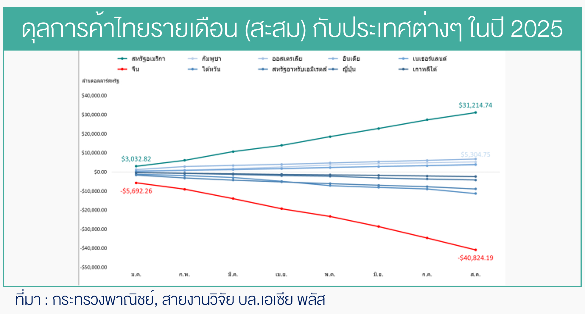 บริษัทหลักทรัพย์ เอเชียพลัส วิเคราะห์ว่า ความตึงเครียมทางการค้าที่เพิ่มขึ้น อาจกดดันภาคการส่งออกไทยต่อเนื่อง โดยเฉพาะการส่งออกจากไทยไปสหรัฐฯ ชะลอตัวลง อีกทั้งในเดือน ส.ค. 68 ที่ผ่านมา มาตรการภาษีสหรัฐฯ เริ่มมีผลบังคับใช้ ส่งผลให้ไทยเกินดุลกับสหรัฐฯ ลดลงเหลือเพียง 3,840 ล้านล้านดอลลาร์ หรือ -15.5% จากเดือนก่อนหน้า (MOM) หลังจากที่มีการเร่งส่งออกสินค้าไปในช่วงครึ่งแรกของปีนี้ (1H68)