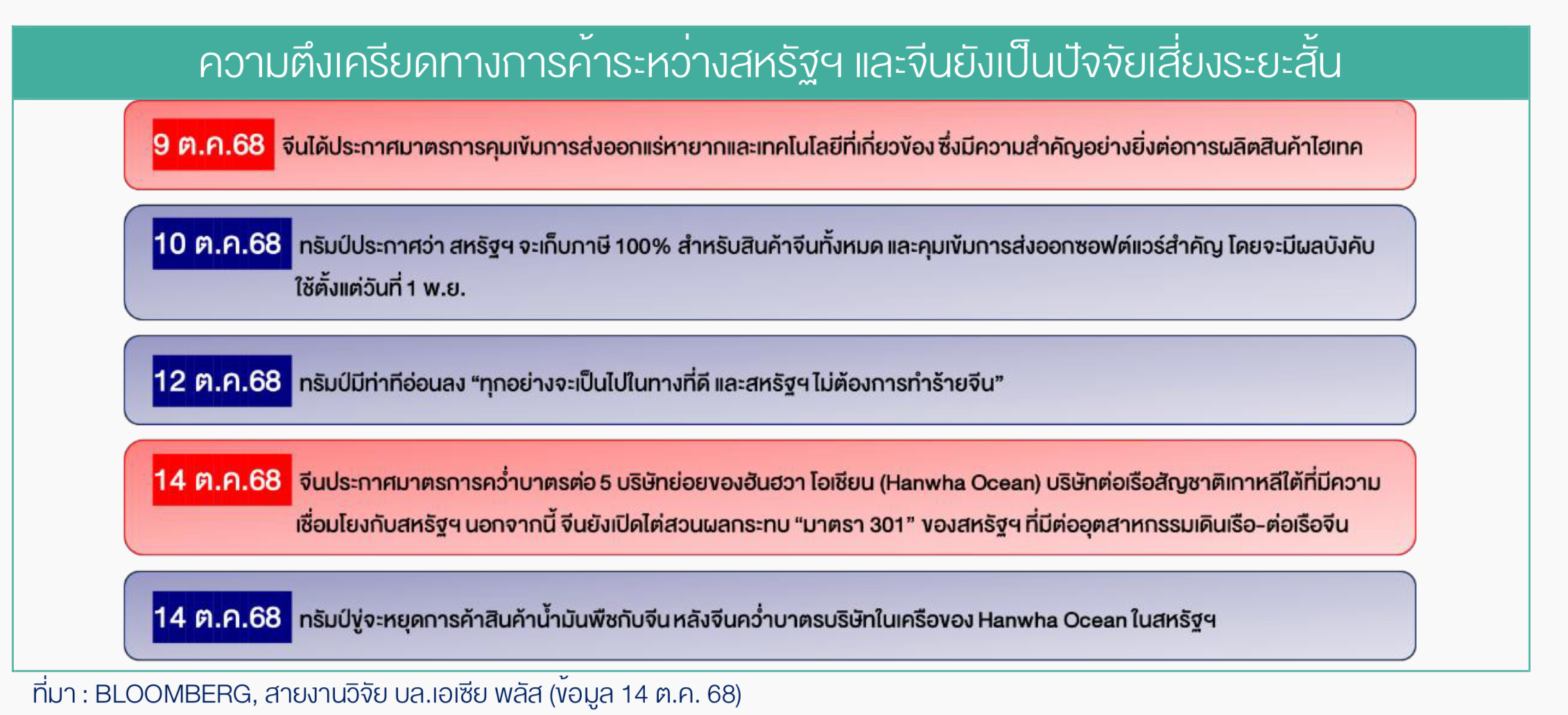 เมื่อต้นเดือน ต.ค. ประธานาธิบดีสหรัฐฯ โดนัลด์ ทรัมป์ ประกาศจะเก็บภาษีนำเข้าสินค้าจีนเพิ่มอีก 100% รวมถึงออกมาตรการควบคุมการส่งออกซอฟต์แวร์สำคัญทุกประเภท เริ่มมีผลวันที่ 1 พ.ย. นี้ แต่ สก็อตต์ เบสเซนต์ รัฐมนตรีคลังสหรัฐฯ ระบุว่า ผู้นำทั้งสองประเทศจะยังมีกำหนดการพบกันนอกรอบการประชุมสุดยอดผู้นำเอเปค ระหว่างวันที่ 31 ต.ค. ถึง 1 พ.ย. โดยมาตรการภาษี 100% อาจไม่จำเป็นต้องเกิดขึ้น หากการเจรจาคืบหน้าในทิศทางที่ดี