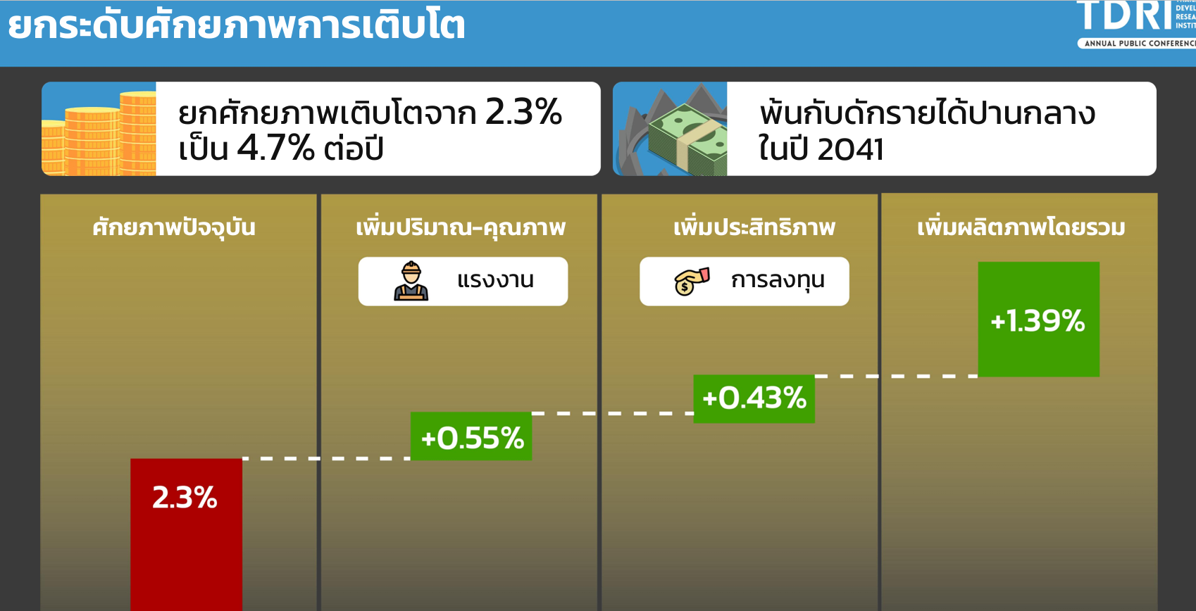 ประธานทีดีอาร์ไอ ระบุว่า ไทยมีแรงงานลดลงจากสังคมสูงวัย และมีเงินทุนที่จำกัด ดังนั้นสิ่งที่ไทยควรทำเป็นอันดับแรกคือ การพัฒนาแบบ “ลีน” ให้มากขึ้น ซึ่งหมายถึงการใช้ทรัพยากรให้คุ้มค่า ใช้กำลังคนให้เต็มเม็ดเต็มหน่วยมากที่สุด โดยลดความสูญเสียและเพิ่มประสิทธิภาพในการใช้ทรัพยากร นอกจากนี้จะต้องเร่งสร้างงานดี หรือ Good Jobs ซึ่งหมายถึงงานที่มีค่าตอบแทนดี สวัสดิการเพียงพอ มีความมั่นคงพอสมควร แต่การที่จะมีทำงานที่ดีได้นั้น คนไทยจะต้องมีทักษะที่มากขึ้น ขณะเดียวกันจะต้องสร้างการเจริญเติบโตผ่านเครื่องจักรใหม่หลายตัวซึ่งสามารถแบกประเทศต่อไปได้