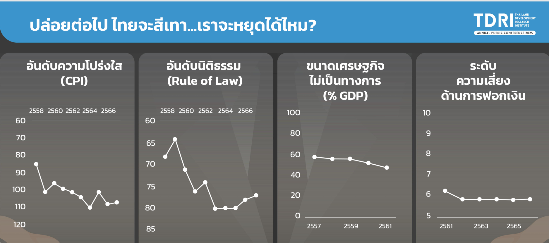 หากไม่สามารถแก้ปัญหาเชิงโครงสร้างเศรษฐกิจได้ ประเทศไทยจะกลายเป็นประเทศที่มีธุรกิจสีเทามากขึ้น ทั้งความเสี่ยงต่อการฟอกเงินรวมถึงการเป็นศูนย์กลางของแก๊งมิจฉาชีพอย่างคอลเซนเตอร์ เพื่อเป็นการป้องกันไม่ให้ไทยเป็นประเทศที่เต็มไปด้วยปัญหา ทั้งความเสี่ยงต่อการฟอกเงินรวมถึงการเป็นศูนย์กลางของแก๊งมิจฉาชีพอย่างคอลเซนเตอร์ เพื่อเป็นการป้องกันไม่ให้ไทยเป็นประเทศที่เต็มไปด้วยปัญหา จึงมีความจำเป็นที่จะต้องสร้างการเจริญเติบโตทางเศรษฐกิจที่สร้างงานที่ดีหรือ “Good Jobs” ให้แก่คนไทย