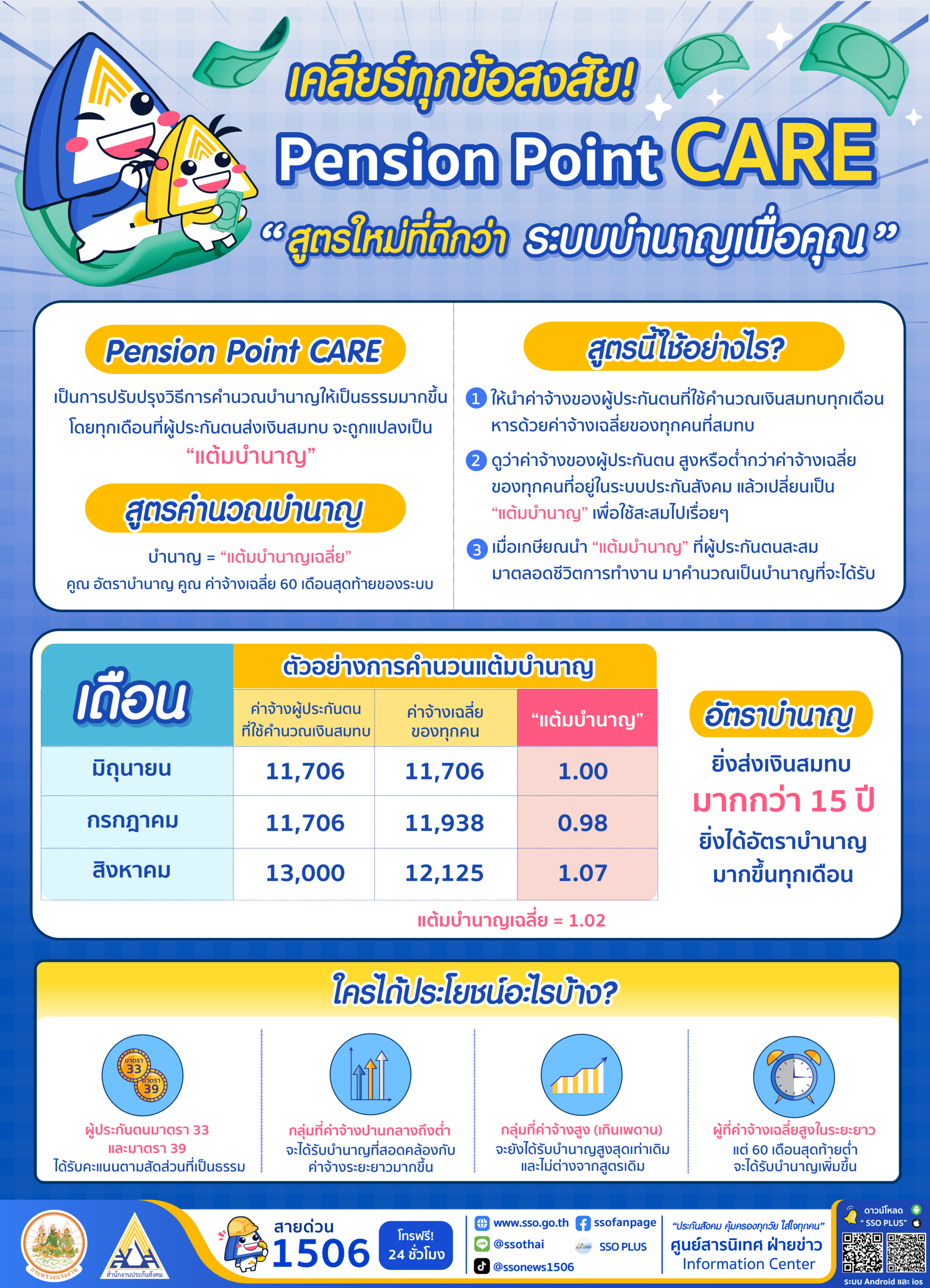 - บำนาญสูตรใหม่ CARE: อัตราบำนาญ 41% ฐานค่าจ้าง 14,974 บาท ได้บำนาญเดือนละ 6,139 บาท