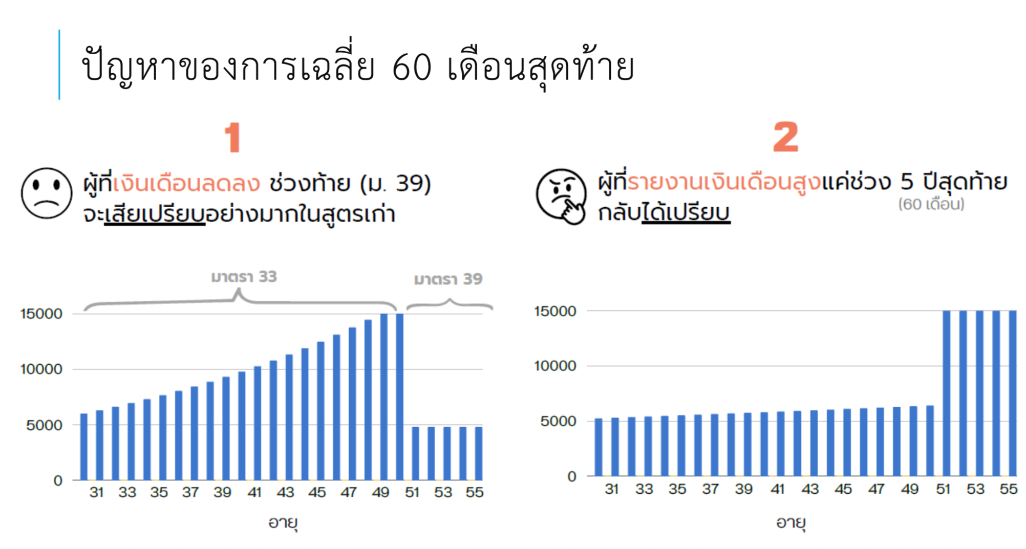 - สูตรเดิม: การคิดฐานค่าจ้างมากจาค่าเฉลี่ย 60 เดือน หรือ 5 ปีสุดท้ายของการส่งเงินสมทบ