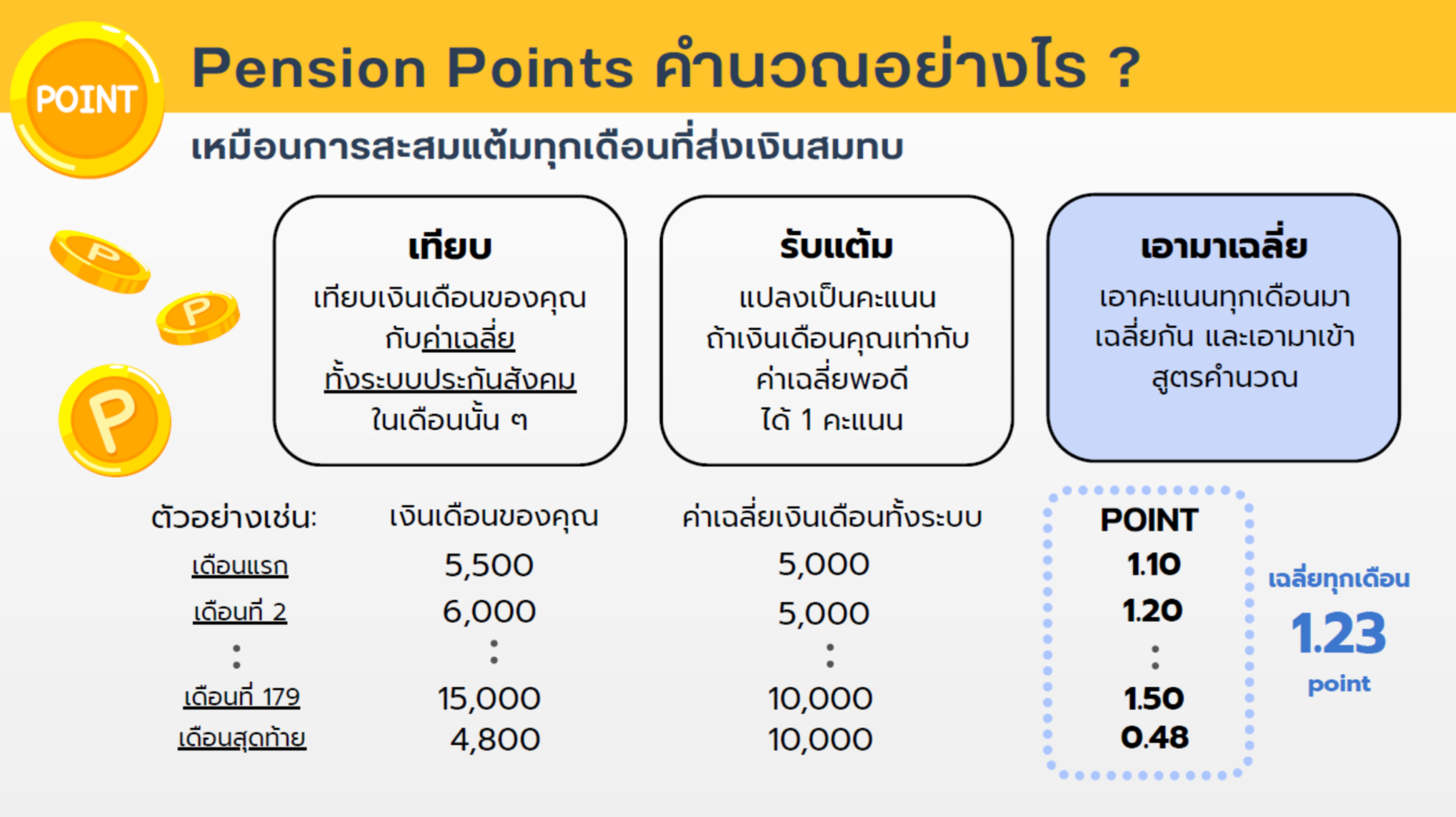 - เอามาเฉลี่ย หลังจากได้แต้มแล้วให้นำแต้มค่าเฉลี่ยของทุกเดือนมาคำนวณในอัตราบำนาญใหม่