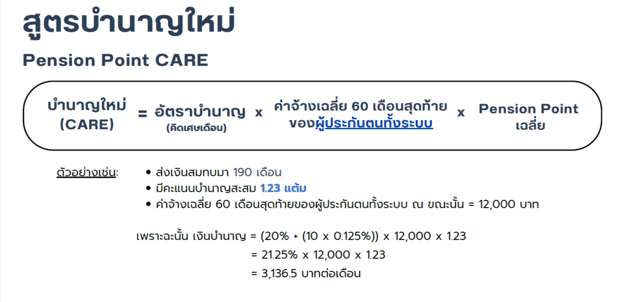 - สูตรบำนาญใหม่ (CARE) = อัตราบำนาญ(คิดเศษเดือน) x ค่าจ้างเฉลี่ย 60 เดือนสุดท้ายของผู้ประกันตนทั้งระบบ x แต้มบำนาญ Pension Point