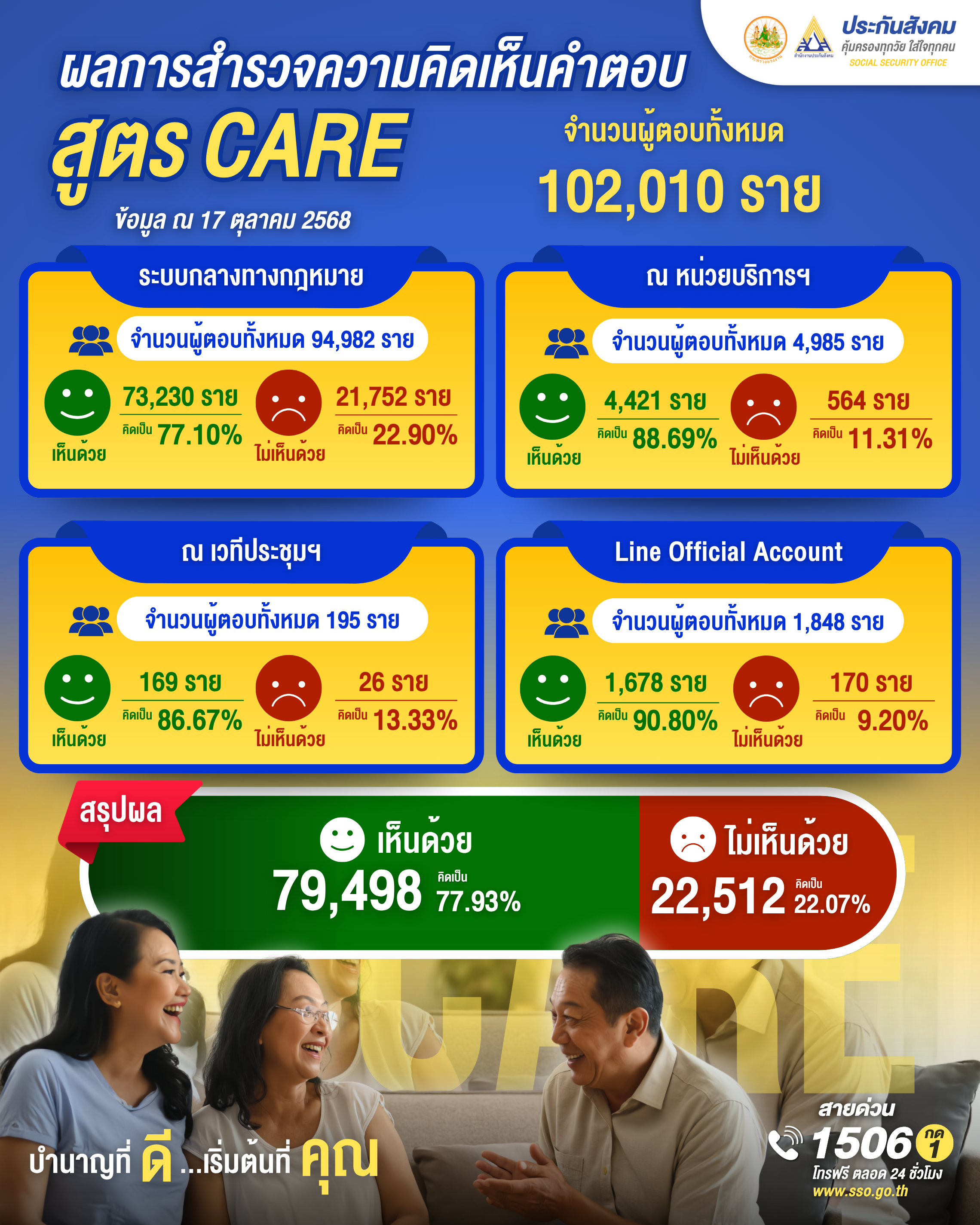 สำนักงานประกันสังคม เปิดเผยผลสำรวจการรับฟังความคิดเห็นปรับปรุงสูตรการคำนวณบำนาญชราภาพ หรือสูตร CARE ของผู้ประกันตนมาตรา 33 และมาตรา 39 ตั้งแต่วันที่ 1-17 ต.ค. 68 โดยภาพรวมผลสำรวจความคิดเห็น มีผู้ตอบแบบสอบถามทุกช่องทางจำนวนทั้งสิ้น 102,010 ราย เห็นด้วย 79,498 ราย คิดเป็นร้อยละ 77.93 ไม่เห็นด้วย 22,512 ราย คิดเป็นร้อยละ 22.07 จำแนกตามช่องทาง ดังนี้