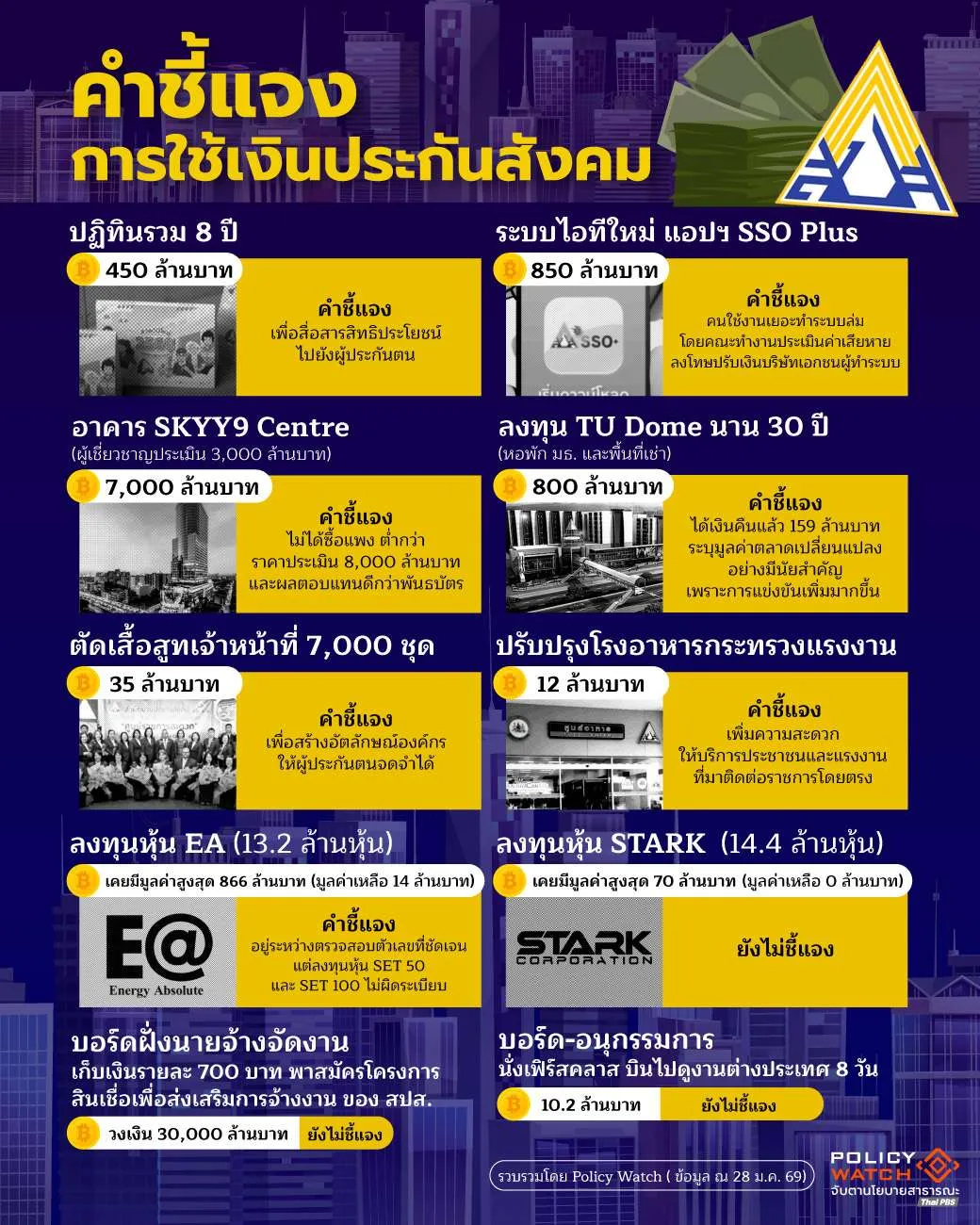 แต่ตลอดระยะที่ผ่านมา สำนักงานประกันสังคมยังเคยไม่เปิดเผยข้อมูลรายละเอียดต่อผู้ประกันตนว่าเงินกองทุนจำนวนมหาศาลถูกนำไปใช้ในด้านใดบ้าง