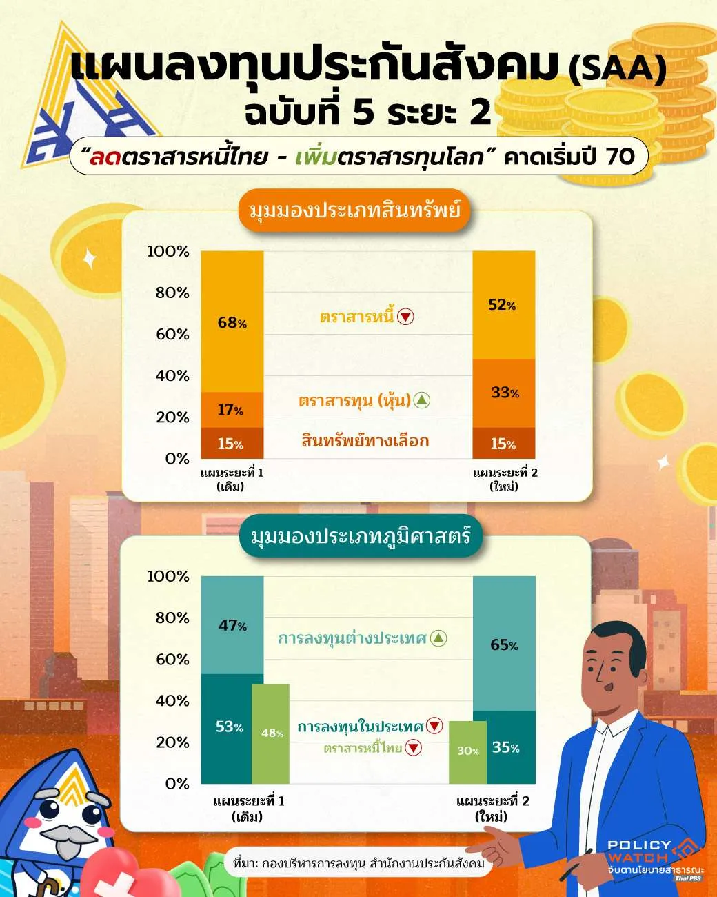 แผน SAA ใหม่ระยะ 2 ของกองทุนประกันสังคม ที่เพิ่มผ่านมติจากบอร์ดประกันสังคม โดยเพิ่มลงทุนสินทรัพย์ในต่างประเทศมากขึ้นและลดการลงทุนในประเทศน้อยลง