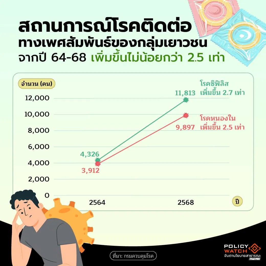 แม้จะถกเถียงกันเรื่องตัวเลข HIV แต่ข้อมูลด้านโรคติดต่อทางเพศสัมพันธ์อื่น ๆ ในกลุ่มเยาวชนกลับชัดเจนและน่าวิตกกังวลอย่างยิ่ง ในช่วงห้าปีที่ผ่านมา โรคซิฟิลิสในกลุ่มเยาวชนเพิ่มขึ้นถึง 2.7 เท่า จาก 4,326 รายพุ่งขึ้นเป็น 11,813 ราย ขณะที่โรคหนองในเพิ่มขึ้น 2.5 เท่า จาก 3,912 รายเป็น 9,897 ราย